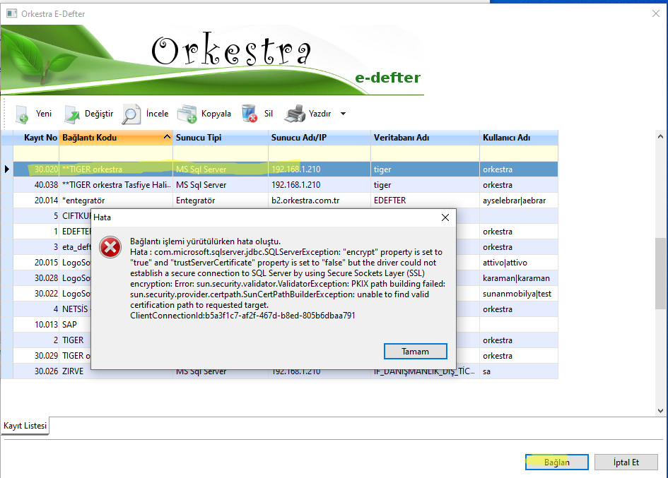 bir durumda trustServerCertificate=true cok eski surumlerde encrypt=false