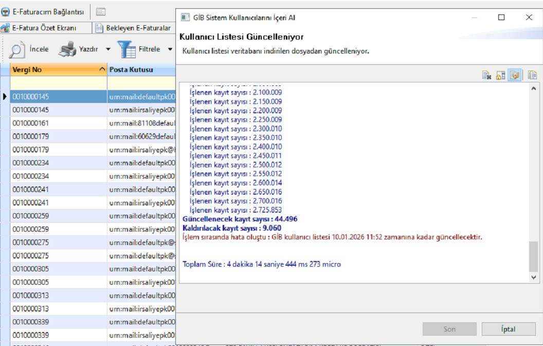 " İşlem sırasında hata oluştu: GİB Kullanıcı Listesi 10.01.2026 11:52 zamanına kadar Güncellenecektir."