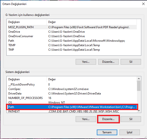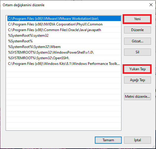 Yeni açılan ortam değişkenleri penceresinde alt kısımdaki “Path” seçilir ve “Düzenle…” butonuna tıklanır.