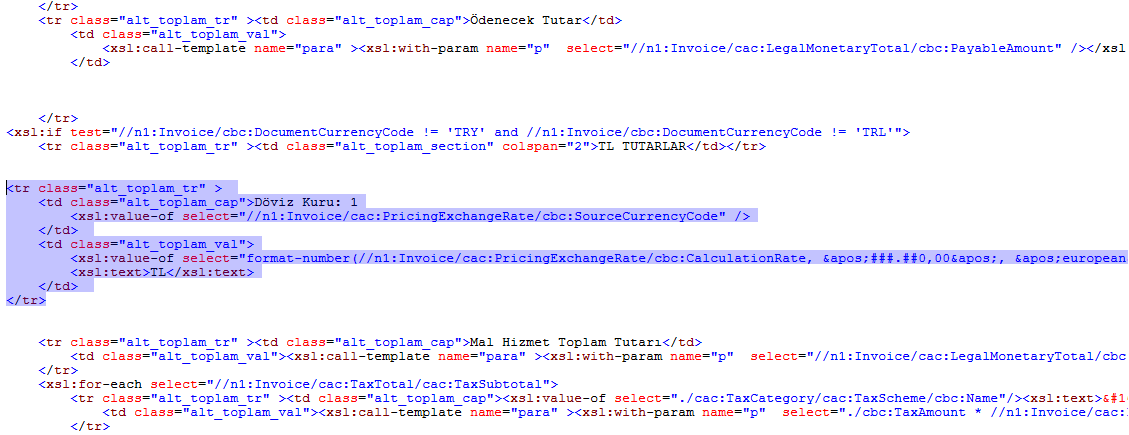 Faturada girilen döviz kurunun fatura alt tutarlar alanında görünmesi için aşağıdaki xslt kod satırını fatura tasrımınızda resimde gösterilen alana yapıştırmalısınız.
