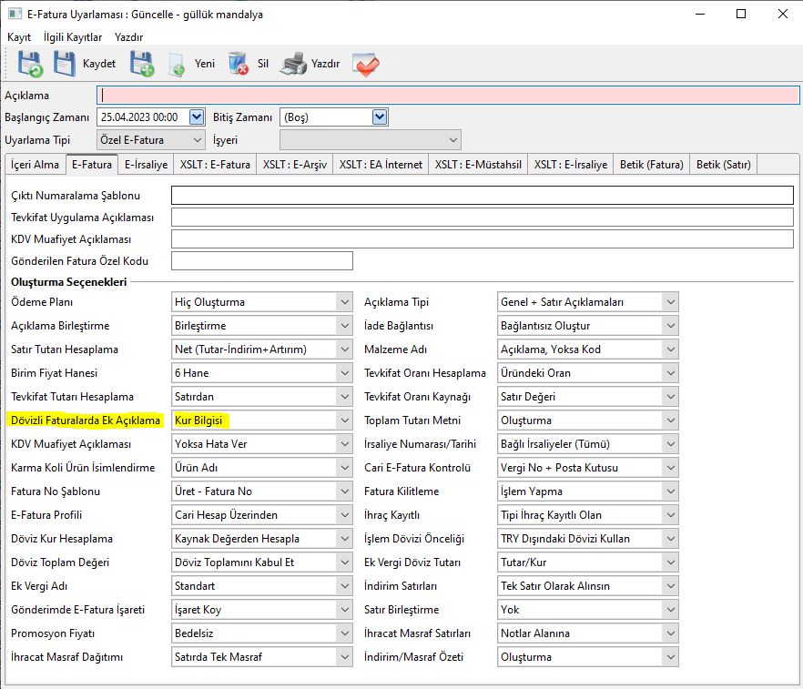 Fatura uyarlamasında Dövili Faturalarda Ek Açıklama ayarının Kur Bilgisi şeklinde ayarlamalısınız.