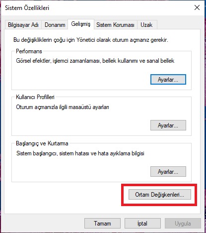 Açılan pencerede “Ortam Değişkenleri…” butonuna tıklanır.