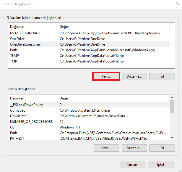 Açılan Ortam Değişkenleri penceresinde “Yeni…” butonuna tıklanarak yeni bir kullanıcı değişkeni tanımlama ekranı açılır.