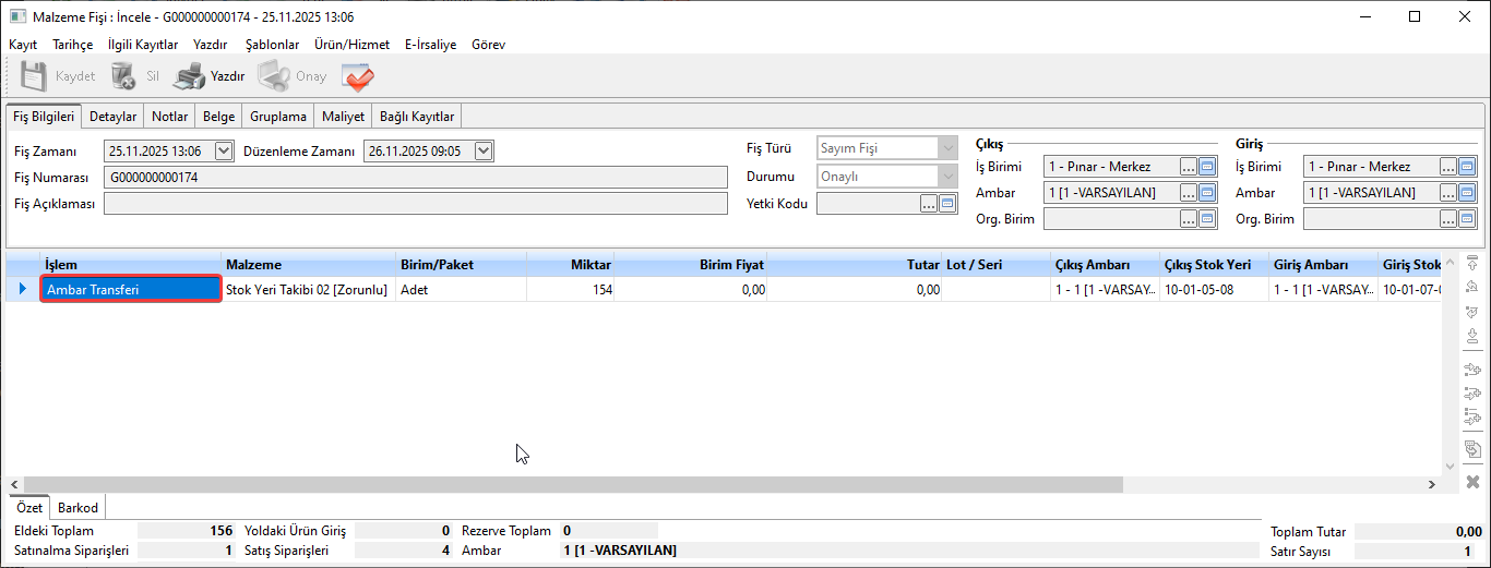 Şayet sayım ile sistemdeki stoklar arasında fark yoksa malzeme fiş satırları oluşmayacaktır. Tüm malzemelerin sayım miktarı ile stok miktarı eşit ise malzeme fişi hiç oluşmaz.