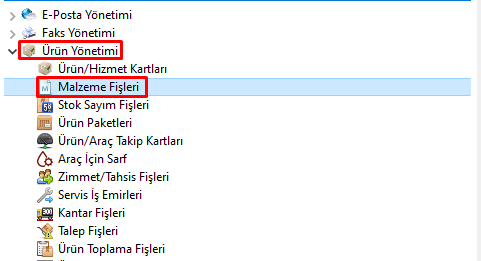 Ürün Yönetimi → Malzeme Fişleri menü adımları takip edilmelidir.