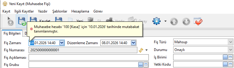 08.01.2026 tarihli muhasebe fişi oluşturulup kaydedilmek istendiğinde, fiş tarihi mutabakat geçerlilik süresi içinde olduğu için sistem hata verir ve fiş kaydedilemez.
