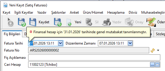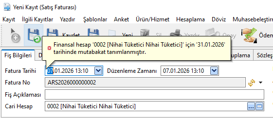 Bu cari hesaba satış faturası düzenlenip kaydedilmek istendiğinde, ilgili finansal hesap için aktif bir mutabakat bulunduğundan sistem hata verir ve fiş kaydedilemez.