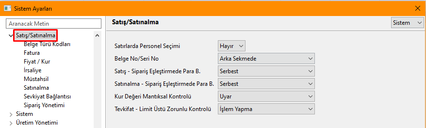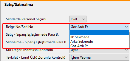 Sistem ayarlarında yer alan "Satış/Satınalma" üst başlığına tıklandığında da ilgili Belge/Seri No Fiş Bilgileri'nde gelecek ya da "Fiş Açıklaması" ile yer değiştirecek şekilde ayarlanabilir.