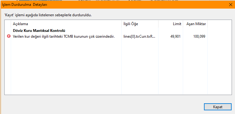 Hata Ver: Kur değeri kontrol sınırını aşan durumlarda sistem hata mesajı verir ve işlemin kaydedilmesini engelleyerek belgeyi durdurur.