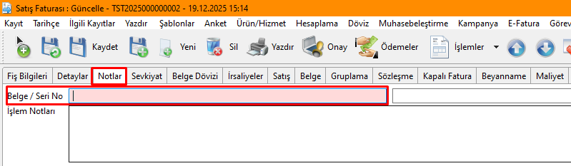 - Arka Sekmede parametresiyle , belgenin notlar kısmında "Belge/Seri No" alanına ulaşabilirsiniz.