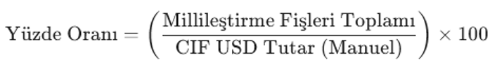 Millileştirme Tutarı / İthalat CIF USD Tutarı × 100