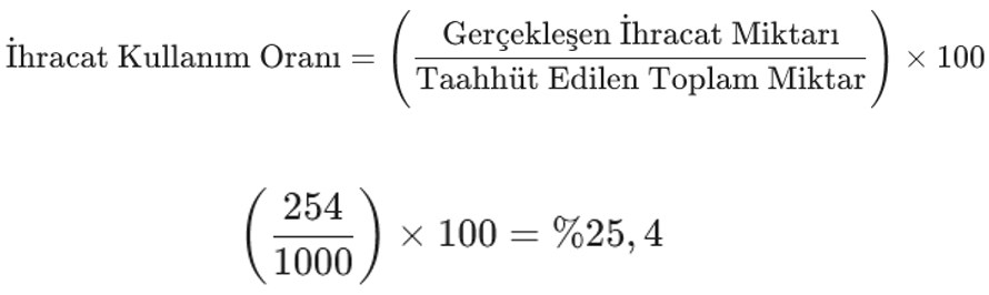 Performans Yüzdesi [%25]: Bu oran, fiilen ihraç edilen miktarın (254), taahhüt edilen toplam miktara (1000) olan yüzde oranını gösterir.