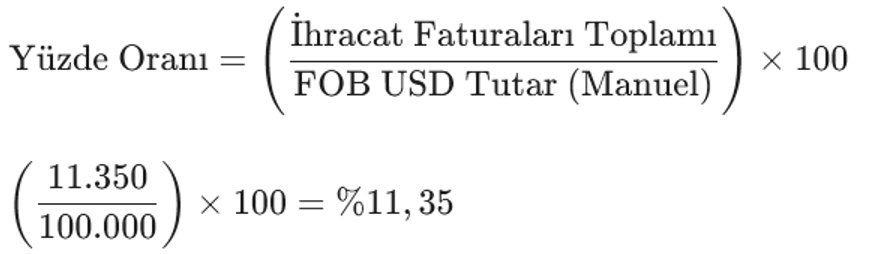 İhracat FOB Tutarı alanındaki %11 [11.350] gösterimi, sistemin o ana kadar gerçekleştirdiğiniz toplam ihracat bedelini kümülatif olarak topladığını ve bunu taahhüt ettiğiniz toplam tutara oranladığını gösterir.
