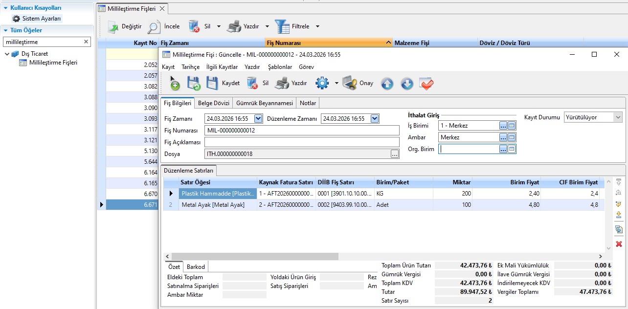 Millileştirme Fişleri ekranı, gümrük süreçleri tamamlanarak millileşen ürünlerin stok girişlerini ve maliyet kayıtlarını toplu olarak görebileceğiniz bir izleme ve raporlama ekranıdır.