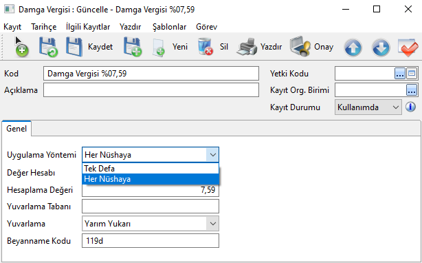 Vergi Türü: Damga Vergisinin hesaplanması ve beyannamede bildirilmesi için daha önce tanımlanan Damga Vergisi Kartının seçildiği alandır. Kart yoksa, "Yeni" butonu ile oluşturulmalıdır.