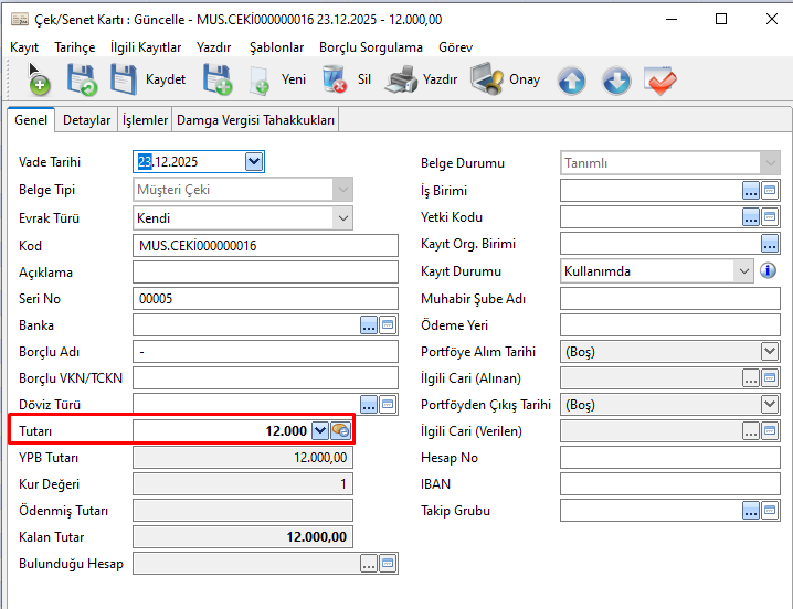 Çek/Senet Tutarı alanına girilen tutar Damga Vergisi Kartı içerisindeki Vergi Matrahı alanına sistem tarafından otomatik gelmektedir.