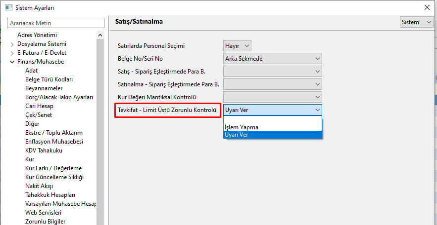 Limit kontrolleri isteğe bağlı olarak kullanılabilir. Bu nedenle hem Tevkifat Kartı içerisine hem de Sistem Ayarlarına yeni parametreler eklenmiştir.