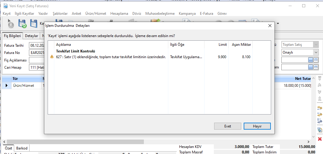 Tevkifat kartı için belirlenen limitin altında kalındığında, sistem kullanıcıya uyarı verir ve tevkifatın kaldırılması gerektiğini önerir.
