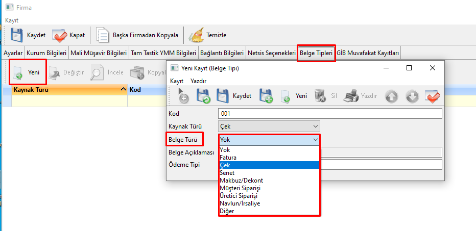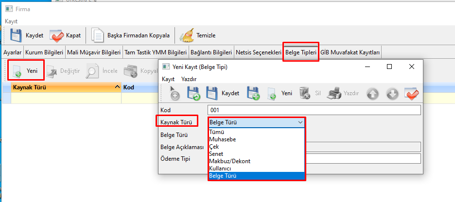 Kaynak Türü alanında hangi değer seçilmiş ise, Belge Türü alanında da aynı değere karşılık gelen belge türü seçilmelidir.