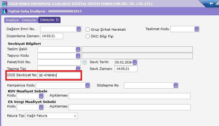 Sevkiyat Numarası: Logo programında irsaliye içerisindeki “detaylar-II“ sekmesine bulunan “IDIS Sevkiyat No” alanına girilmelidir.