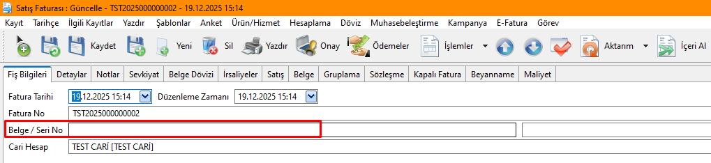 - Arka Sekmede parametresiyle , belgenin notlar kısmında "Belge/Seri No" alanına ulaşabilirsiniz.