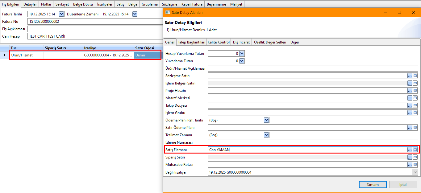 Satırlara ait bu "Satış Elemanı" alanının kaldırılıp kaldırılmamasını için sistem ayarlarından Evet ve Hayır dememiz yeterli olacaktır.