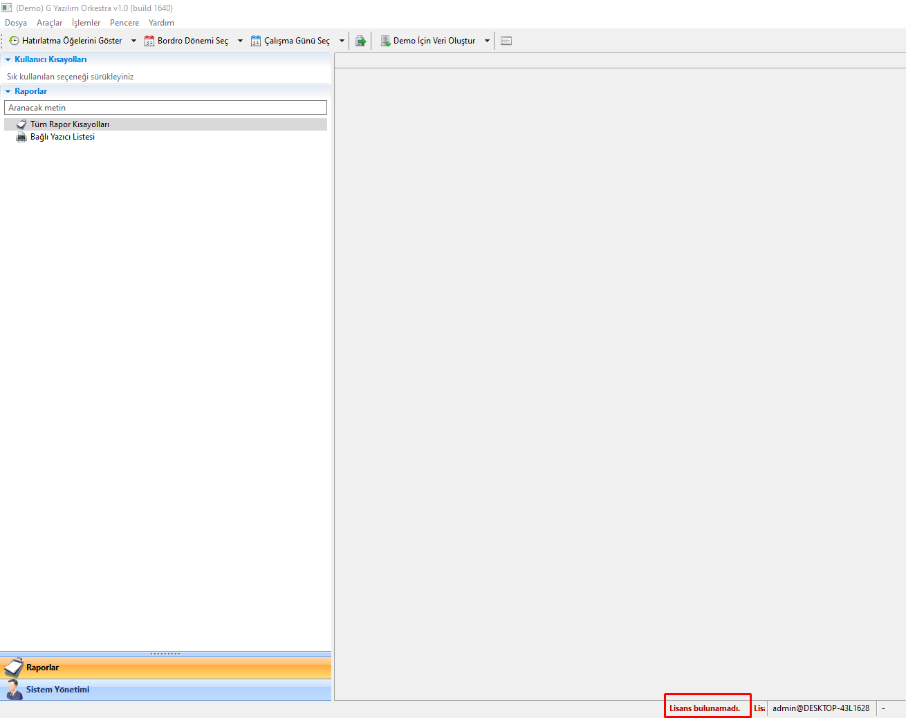 Uygulama ilk açıldığında, sistemde herhangi bir lisans tanımlı değilse ekranın alt kısmında “Lisans bulunamadı” uyarısı görüntülenir.