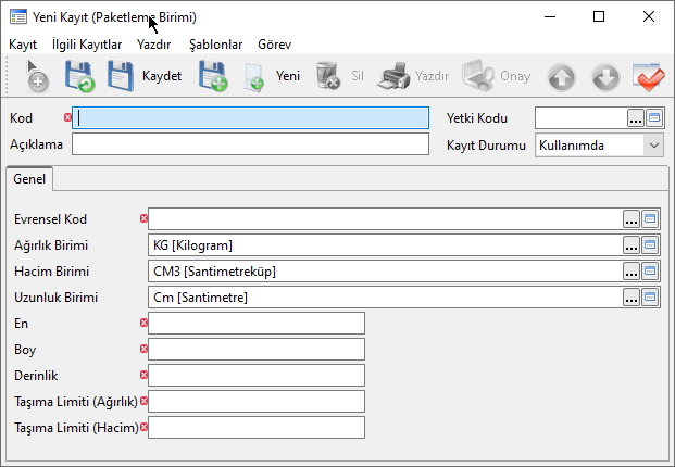 - Kullanım Amacı: Çeki listesi oluşturulurken malın nasıl paketlendiğini (Koli, Palet, Big Bag, Varil vb.) sistemsel olarak seçmek için kullanılır.