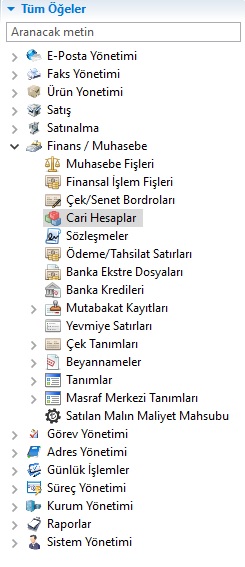 Finans / Muhasebe Öğesi altındaki Cari hesaplar kartı, Adres yönetimi Öğesi altındaki Firmalar kartından farklıdır.