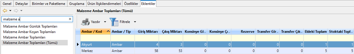 Malzeme Ambar Toplamları: Ambar Toplamı, ürünlerin hangi ambarda hareketi bulunuyorsa; Giriş- Çıkış miktarları, Eldeki ve Stoktaki Toplamlarını göstermektedir. Finansal Dönem içerisindeki tüm giriş ve çıkışlar hesaplanarak bir liste oluşturulur. Bu listeye ilgili ürün kartı için Eklentiler sekmesinden hızlıca erişim sağlanmaktadır.