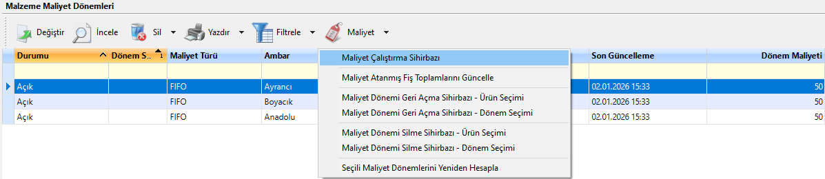 Maliyet → Maliyet Çalıştırma Sihirbazı menüsü üzerinden, istenilen zaman aralığı için anlık olarak maliyet hesaplaması gerçekleştirilebilir.