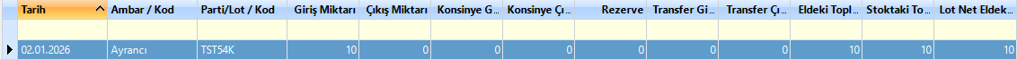 Parti/ Ambar Koşan Toplamları: Ürüne ait lot numaralarını tüm giriş-çıkış hareketlerini izleyebileceğiniz, lot bazlı stok toplamlarını ve anlık bakiyelerini görüntüleyebileceğiniz alandır.