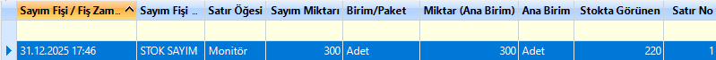 Stok Sayımı Fiş Satırları: İlgili ürünün hangi sayım belgesinde bulunduğunu , satırda bulunan stok miktarını , satır numarasını , ve ana birimini görüntüleyebileceğimiz alandır.