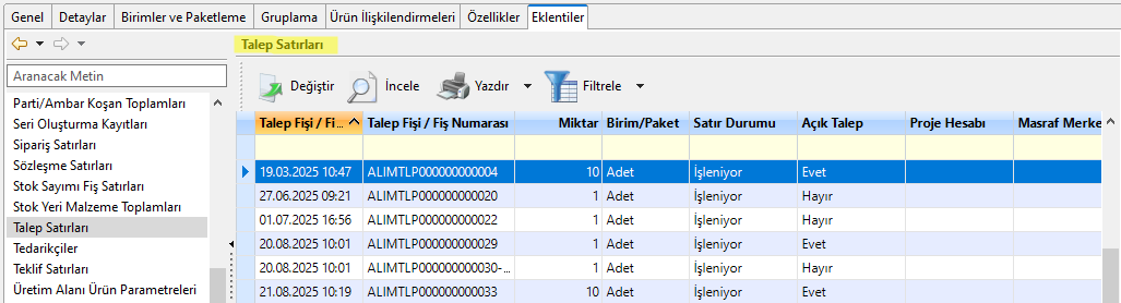 Kolonlarda Talep Fişi Tarih/Saati, Talep Fişi Numarası, Miktarı, Birim/Paketi, Satır Durumu, Açık Talebi varsa Proje Hesabı ve Masraf Merkezi görüntülenir. Böylece ilgili ürün kartının hangi talep satırlarında ne kadarlık miktarda olduğu incelenir.