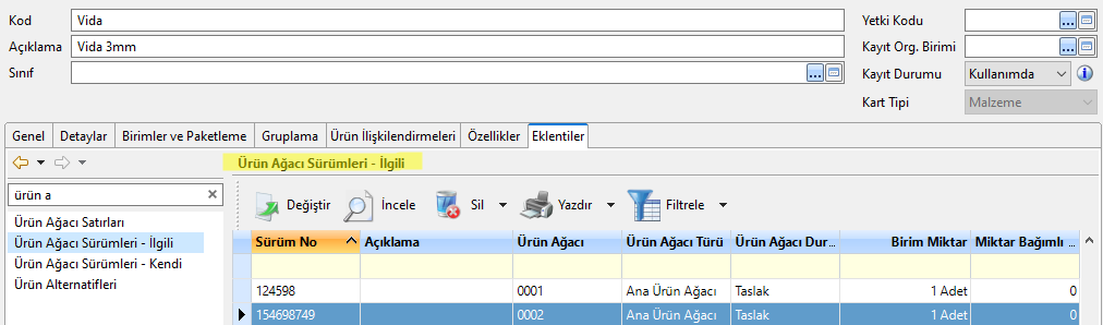 Örneğin Vida kodlu ürün için iki adet Ürün Ağacı Sürümü bulunmaktadır. İlgili ürün, iki adet Ürün Ağacına bağlı yani iki Ürün Ağacının satırlarında ‘Vida’ kodlu ürün bulunmaktadır.