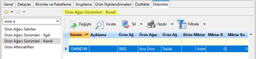 İlgili ürün kartının, bağlı olduğu Ürün Ağacı Sürümlerini görebilmek için Eklentiler sekmesinden Ürün Ağacı Sürümleri – İlgili menüsüne tıklanır. Böylece ürünün bağlı olduğu diğer Ürün Ağaçlarına, Sürüm Numarası gibi bilgilere ulaşılabilmektedir.