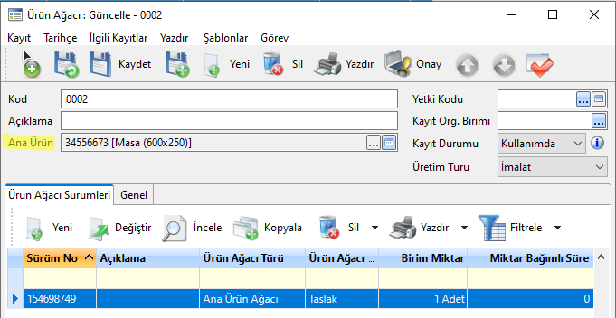 Ürün/Ürün Ağacı Sürümleri - Kendi: Ürün Ağacı oluşturulurken nihai ürün ve bu ürüne bağlı olarak Ürün Ağacı Satırlarında alt ürünler seçilmektedir. Alt ürünler Ürün Ağacı Satırlarında yer almakta; nihai ürün ise Ürün Ağacında Ana Ürün olarak yer almaktadır.
