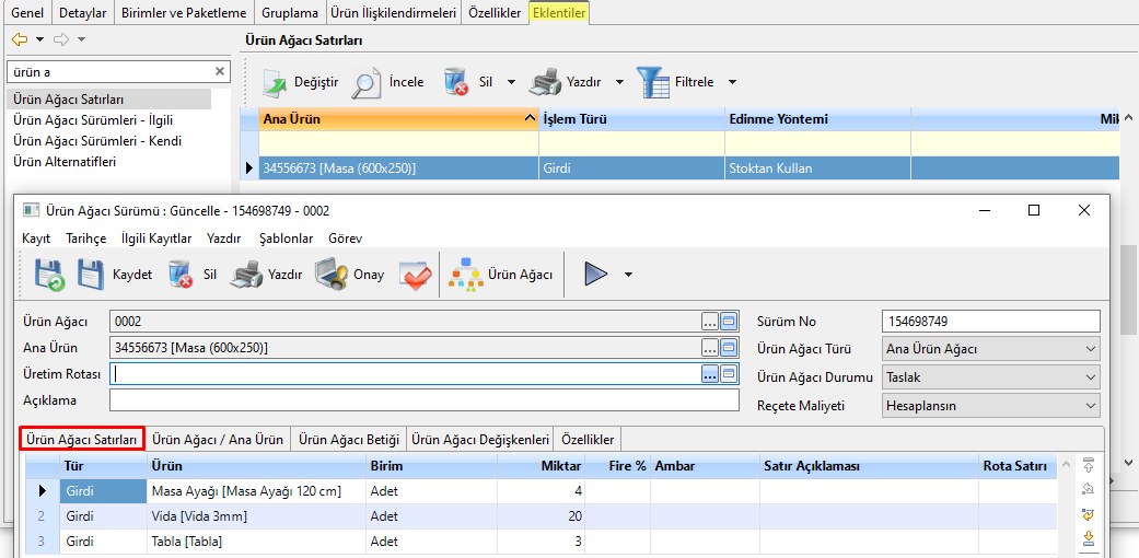 Ürün Ağacı Satırları: Ürün Ağacı, bir mamulün üretilebilmesi için gerekli olan hammadde, yarı mamul, yardımcı malzeme ve bileşenlerin, hangi miktarlarda, hangi sırayla ve hangi koşullarda kullanılacağını tanımlayan yapıdır. Ürüne ait ürün ağacında yapılan değişikliklerin izlenebilmesi, geçmiş üretim kayıtlarının bozulmaması ve farklı dönemlerde farklı reçetelerle üretim yapılabilmesi amacıyla Ürün Ağacı Sürümleri kullanılmaktadır.