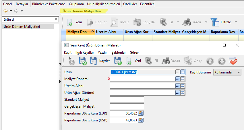Ürünün belirli aralıktaki maliyetlerini hesaplamak istediğimizde Ürün/Hizmet Kartında Eklentiler sekmesindeki Ürün Dönem Maliyeti kaydı oluşturulabilmektedir.