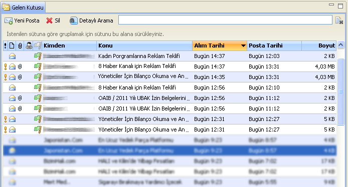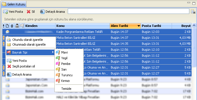 Seçilen postalara uygulanmış bayraklar aşağıdaki gibidir. Herhangi bir posta yada postalardan eklediğiniz bayrakları kaldırmak için yine yukarıda anlatılan yol izlenir. Son işlem adımında bayrak tipi değil "Temizle" seçeneği işaretlenir.