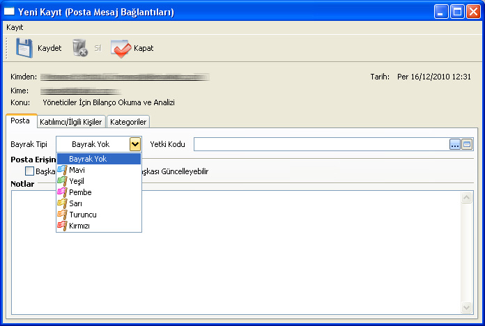 Açılan " Posta Mesaj Bağlantıları" ekranının "Posta" sekmesinde yer alan "Bayrak Tipi" alanına tıklanır. Mesaj için istenilen Bayrak tipi seçildikten sonra, ekranın üst kısmında bulunan "Kaydet" butonuna tıklanarak bayrak tipi kayıt edilir.